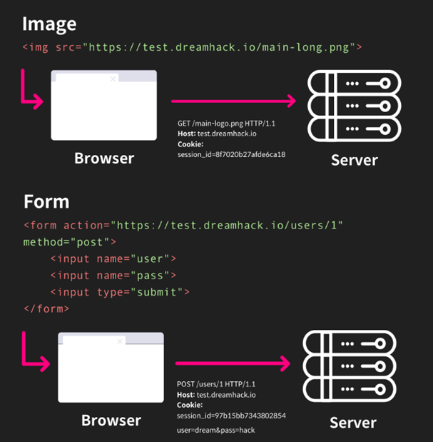 - CSRF: 이용자가 임의 페이지에 HTTP 요청을 보내는 것을 목적으로 함