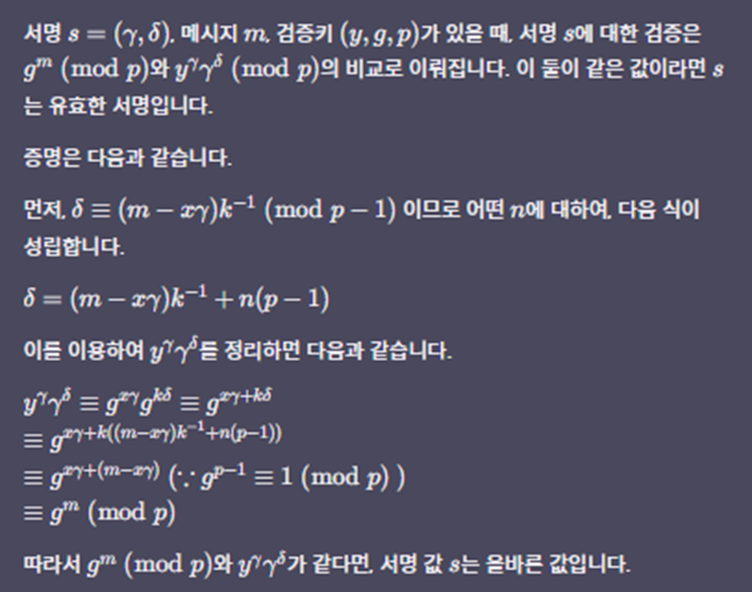 - ElGamal 전자 서명을 모태로하여 DSA(Digital Signature Algorithm) 전자 서명 등 다양한 전자 서명이 설계됨