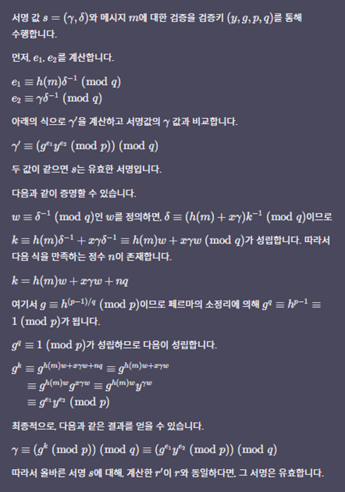 → 그 결과 같은 값이라면 s는 유효한 서명이고, 그렇지 않다면 유효한 서명이 아님.