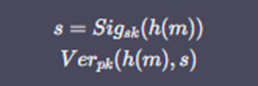 → 위의 과정을 통해 만들어진 서명을 메시지와 함께 보내면 수신자는 서명자의 검증키를 이용해 $$ Ver_{pk}(m,s)$$ 값을 계산하여 이를 검증함
