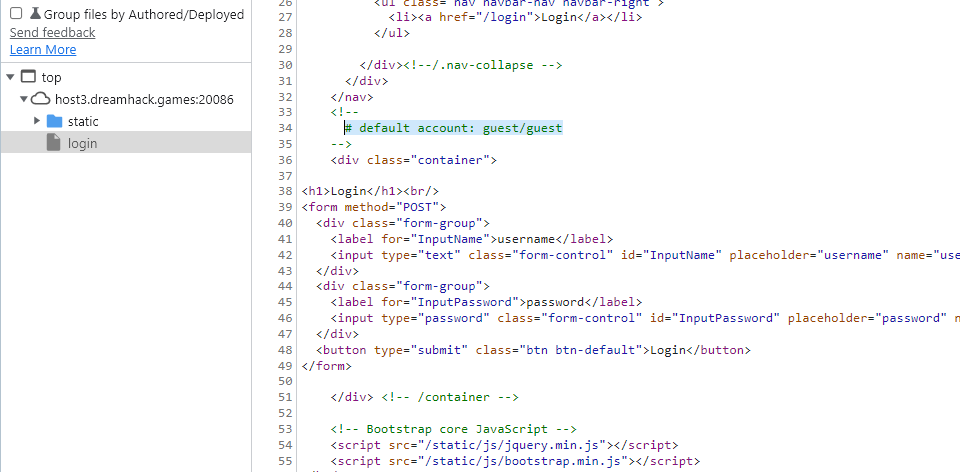 개발자 도구를 열어서 보던 중, default 계정이 guest/guest라고 되어 있었다.